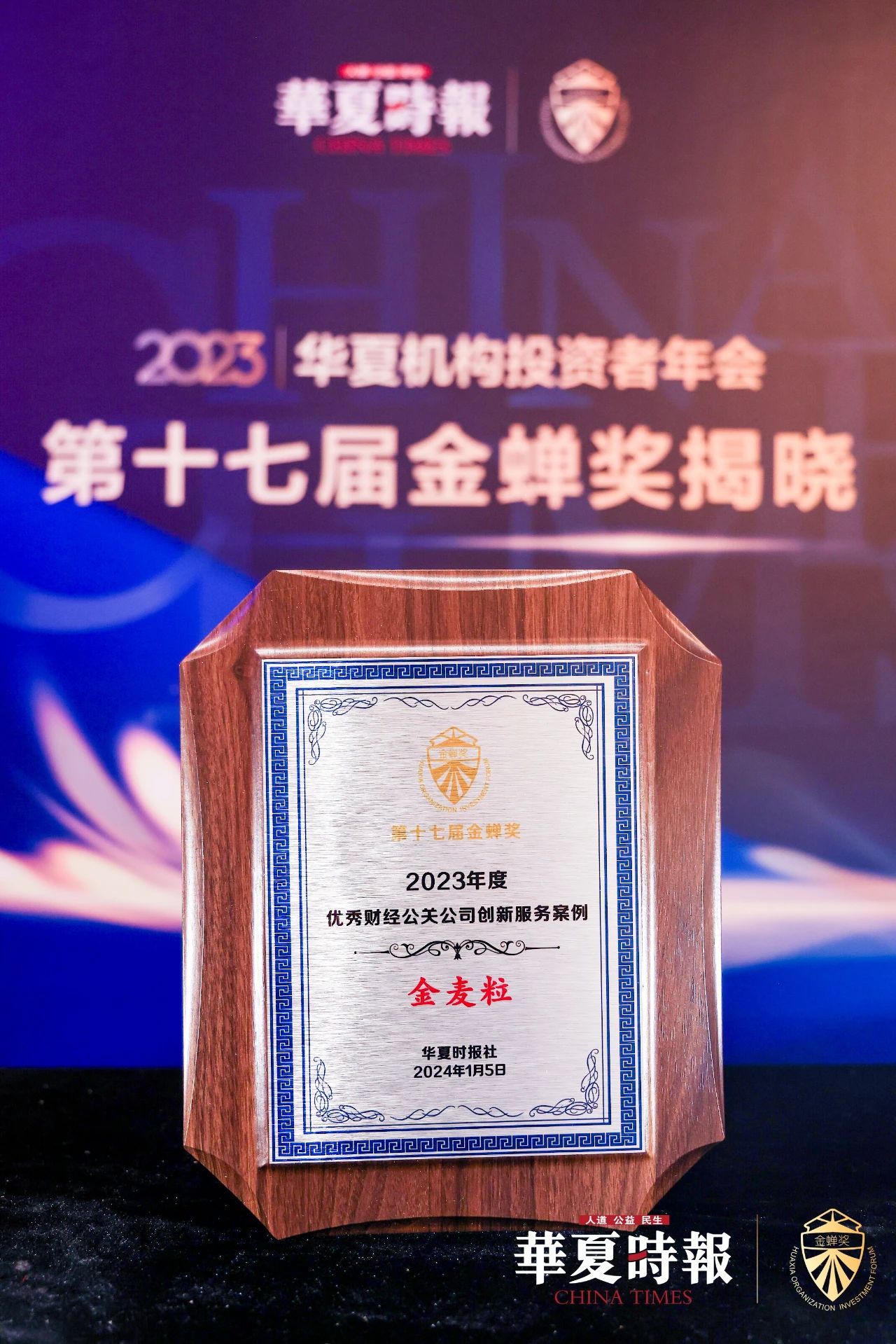 2024年1月5日,由华夏时报社主办的“2023华夏机构投资者年会”在北京隆重举行,经济领域知名学者、金融行业优秀企业代表等齐聚一堂,共同为中国经济高质量发展建言献策。活动现场也同步揭晓了第十七届金蝉奖的获奖名单。深圳市金麦粒传媒科技有限公司凭借优质、创新的专业服务,斩获第十七届金蝉奖“2023年度优秀财经公关公司创新服务案例”单类别唯一大奖。